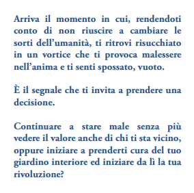 Continuare a stare male senza più vedere il valore anche di chi ti sta vicino, oppure iniziare a prenderti cura del tuo giardino interiore ed iniziare da lì la tua rivoluzione?